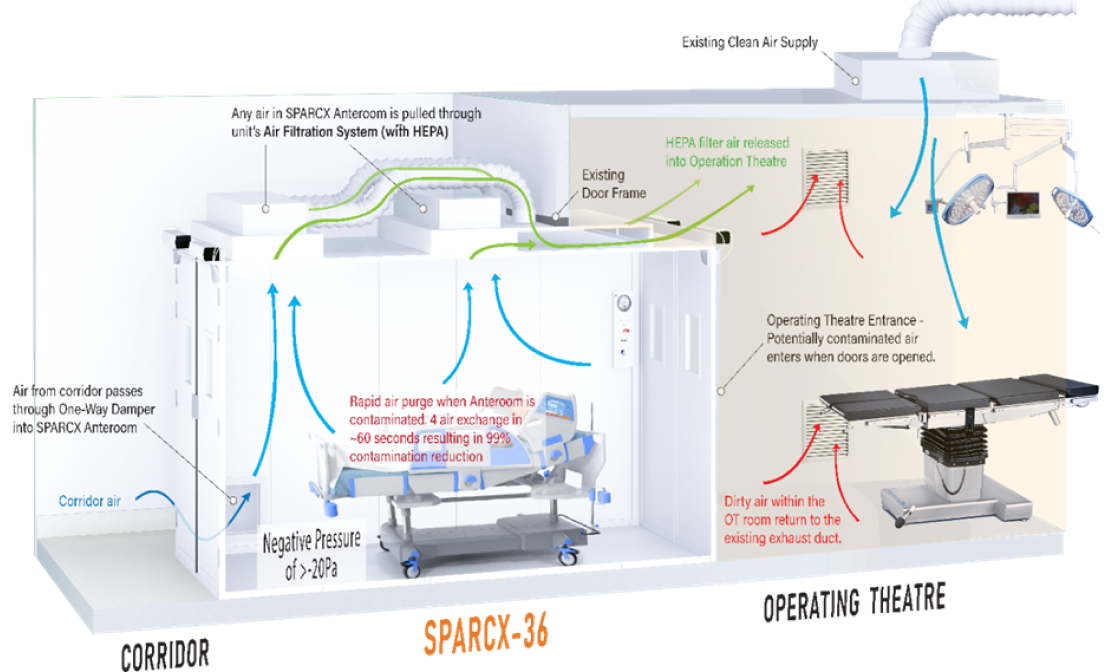 SPARCXTM is an innovative system that can instantly upgrade critical hospital infrastructure such as Operating Rooms & ICUs with clinically proven isolation. The patented air cleaning feature provides safer isolation and costs less than half standards with zero downtime.